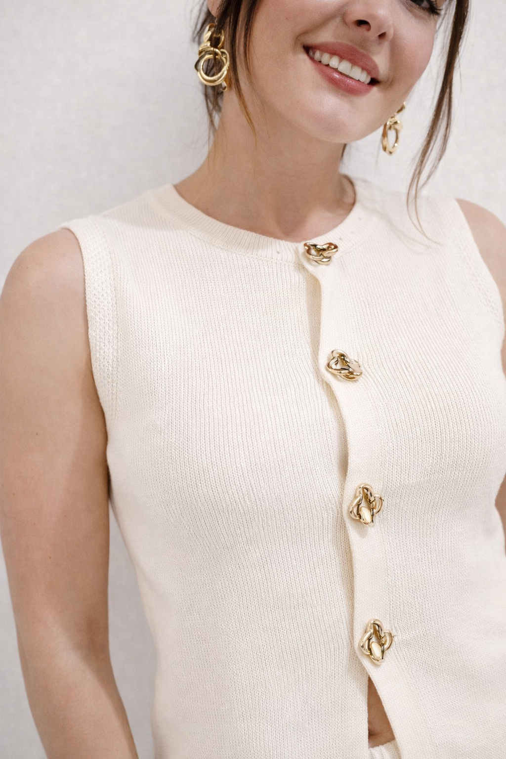 El chaleco tejido sin mangas, con botones metálicos protagonistas, aporta un toque moderno y chic, perfecto para llevar cerrado o semiabierto según tu estilo. El pantalón de corte recto y caída fluida estiliza visualmente las piernas y brinda libertad de movimiento, convirtiéndolo en una opción ideal tanto para el día como para la noche.